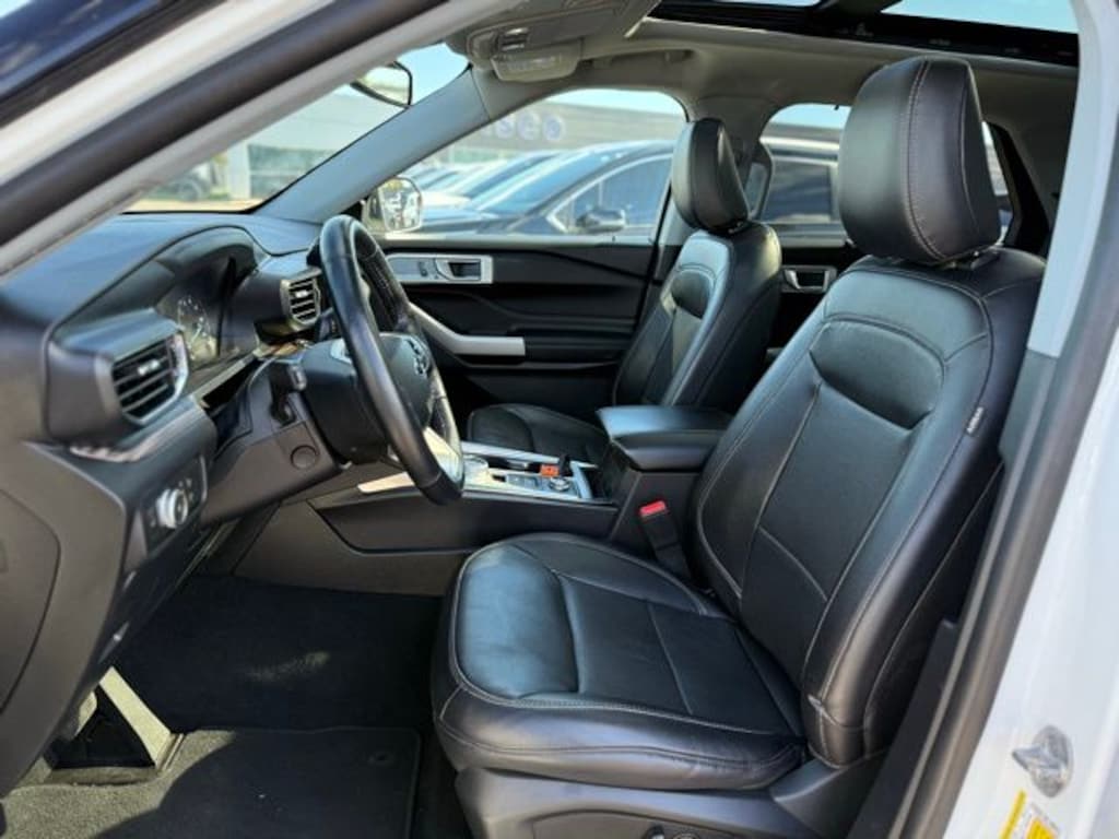 Certified. 2021 Ford Explorer Limited Oxford White 4WD 2.3L EcoBoost I-4 4WD, 12 Speakers, 20" Premium Painted Aluminum Wheels, 3.58 Non-Limited-Slip Rear Axle Ratio, 3rd row seats: bench, 4-Wheel Disc Brakes, ABS brakes, Air Conditioning, Alloy wheels, AM/FM radio: SiriusXM, Auto High-beam Headlights, Auto-dimming Rear-View mirror, Automatic temperature control, Brake assist, Bumpers: body-color, Compass, Delay-off headlights, Driver door bin, Driver vanity mirror, Dual front impact airbags, Dual front side impact airbags, Electronic Stability Control, Emergency communication system: SYNC 3 911 Assist, Equipment Group 301A, Exterior Parking Camera Rear, FordPass Connect, Four wheel independent suspension, Front anti-roll bar, Front Bucket Seats, Front Center Armrest, Front dual zone A/C, Front fog lights, Front License Plate Bracket, Front reading lights, Fully automatic headlights, Garage door transmitter: HomeLink, Heated door mirrors, Heated front seats, Heated rear seats, Heated steering wheel, Illuminated entry, Knee airbag, Leather Heated/Ventilated Captain's Chairs, Leather steering wheel, Low tire pressure warning, Navigation System, Occupant sensing airbag, Outside temperature display, Overhead airbag, Overhead console, Panic alarm, Passenger door bin, Passenger vanity mirror, Power door mirrors, Power driver seat, Power Liftgate, Power passenger seat, Power steering, Power windows, Radio data system, Radio: B&O Sound System by Bang & Olufsen, Rain sensing wipers, Rear air conditioning, Rear anti-roll bar, Rear reading lights, Rear window defroster, Rear window wiper, Remote keyless entry, Roof rack: rails only, Security system, Speed control, Speed-sensing steering, Speed-Sensitive Wipers, Split folding rear seat, Spoiler, Steering wheel mounted audio controls, SYNC 3 Communications & Entertainment System, SYNC 3/Apple CarPlay/Android Auto, Tachometer, Telescoping steering wheel, Tilt steering wheel, Traction control, Trip computer, Turn signal indicator mirrors, Twin Panel Moonroof, Variably intermittent wipers, Ventilated front seats, Voice-Activated Touchscreen Navigation System.