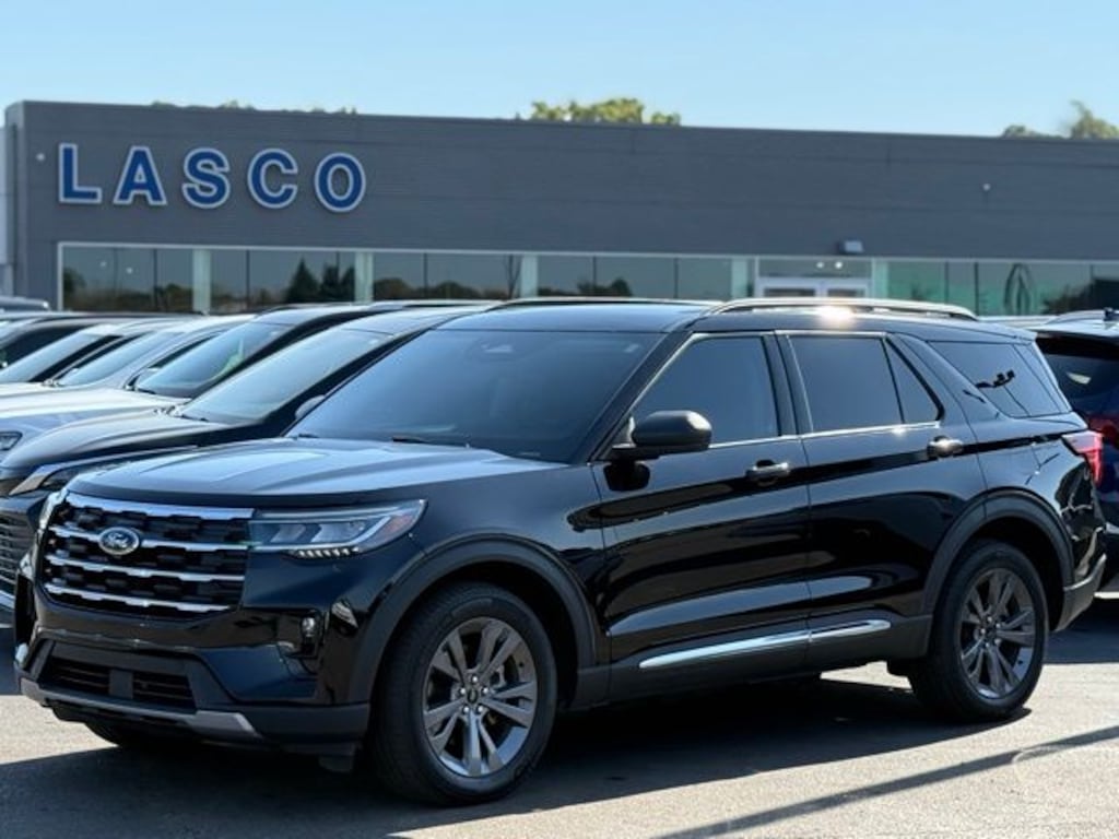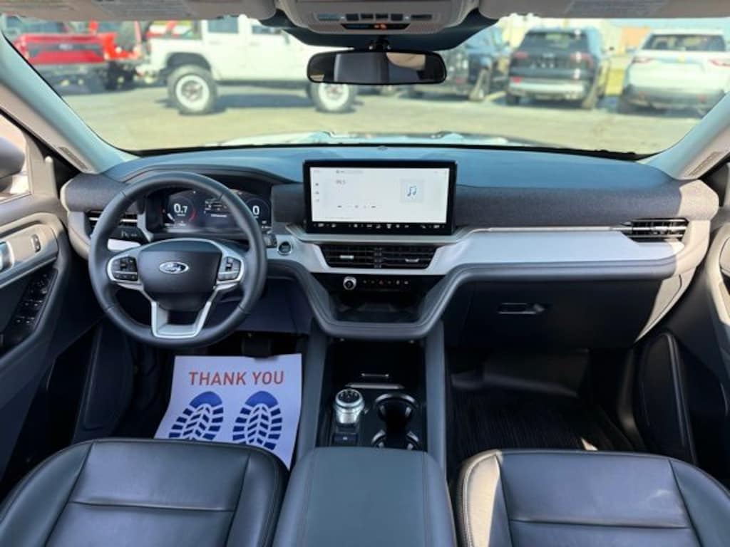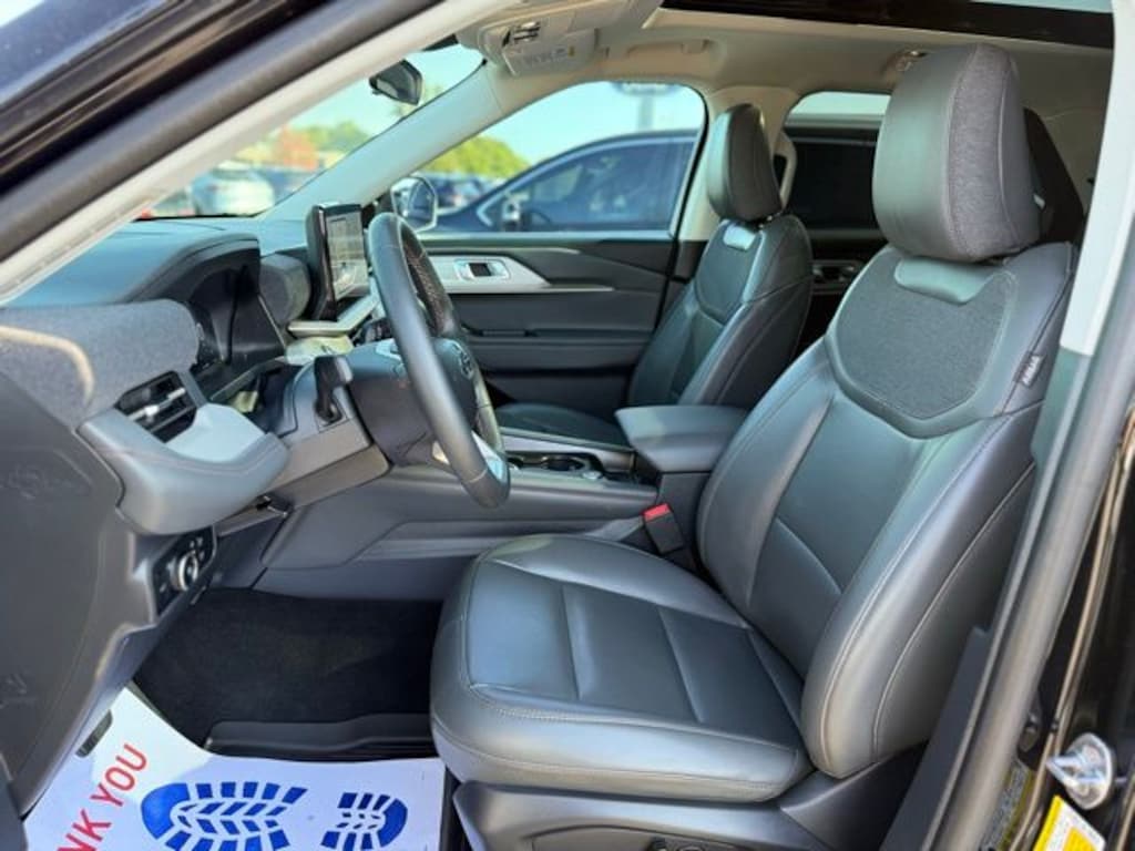 Certified. 2025 Ford Explorer Active Black Metallic 4WD 2.3L EcoBoost I-4 Accident Free CARFAX History Report, Local Trade In, 4WD, 3.58 Non-Limited Slip Rear Axle, 3rd row seats: bench, 4-Wheel Disc Brakes, 6 Speakers, ABS brakes, Active Comfort Package, Air Conditioning, Alloy wheels, AM/FM Stereo, Apple CarPlay/Android Auto, Auto High-beam Headlights, Automatic temperature control, Brake assist, Bumpers: body-color, Compass, Delay-off headlights, Driver door bin, Driver vanity mirror, Dual front impact airbags, Dual front side impact airbags, Electronic Stability Control, Emergency communication system: 911 Assist, Equipment Group 200A Standard Package, Exterior Parking Camera Rear, Four wheel independent suspension, Front anti-roll bar, Front Bucket Seats, Front Center Armrest, Front dual zone A/C, Front Fascia, Front reading lights, Fully automatic headlights, Heated ActiveX Seating Material Captain's Chairs, Heated door mirrors, Heated front seats, Heated Steering Wheel, Illuminated entry, Knee airbag, Leather steering wheel, Low tire pressure warning, Navigation System, Occupant sensing airbag, Outside temperature display, Overhead airbag, Overhead console, Panic alarm, Panoramic Vista Roof w/Power Shade, Passenger door bin, Passenger vanity mirror, Power door mirrors, Power driver seat, Power Liftgate, Power passenger seat, Power steering, Power windows, Rear air conditioning, Rear anti-roll bar, Rear reading lights, Rear window defroster, Rear window wiper, Remote keyless entry, Remote Start System, Second Row HVAC Controls, Security system, Speed control, Speed-sensing steering, Speed-Sensitive Wipers, Split folding rear seat, Spoiler, Steering wheel mounted audio controls, Tachometer, Telescoping steering wheel, Tilt steering wheel, Traction control, Trip computer, Unique Heated Cloth Captain's Chairs, Universal Garage Door Opener (UGDO), Variably intermittent wipers, Wheels: 18" Sparkle Silver-Painted Aluminum, Wheels: 20" Carbonized Gray-Painted Aluminum.