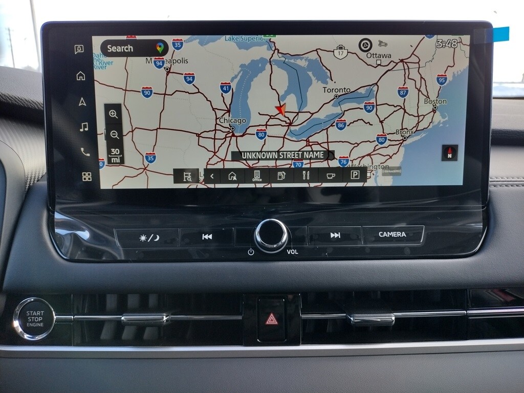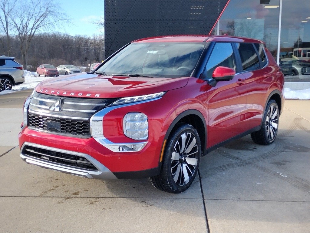 Inside, the Outlander SE offers seating for seven with synthetic leather suede seating surfaces. Comfort features include heated front seats, a heated leather-wrapped steering wheel, and dual-zone automatic climate control. Technology highlights include a 12.3-inch Smartphone-Link Display Audio system with navigation, wireless Apple CarPlay, wireless Android Auto, a wireless smartphone charger, a Yamaha premium audio system with eight speakers, FAST-Key entry with push-button start, a multi-view camera system, and a drive mode selector with Tarmac, Gravel, Snow, Normal, Eco, and Mud modes.