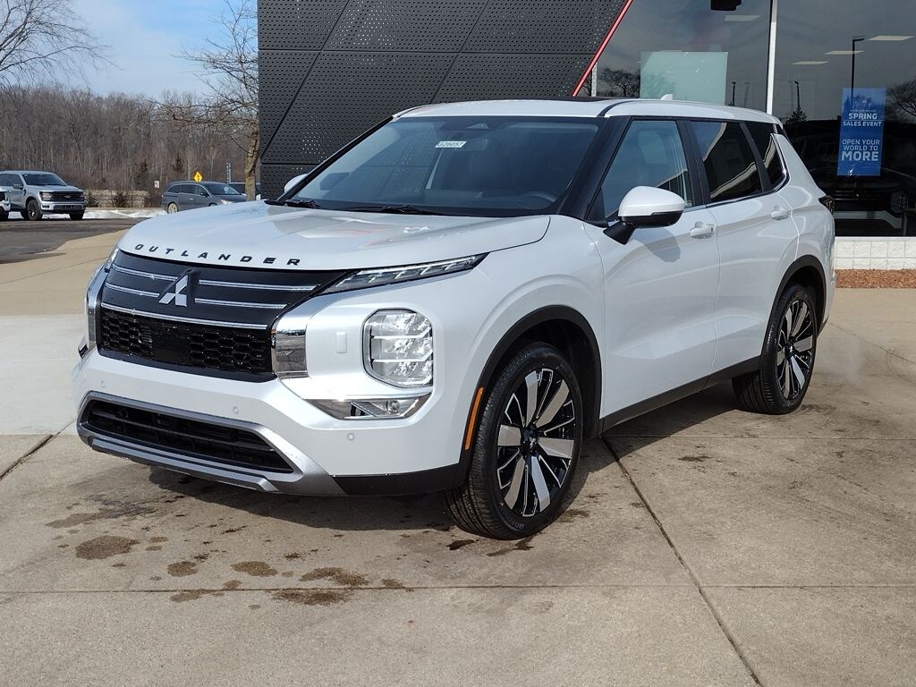 Diamond White 2026 Mitsubishi Outlander SE Tech Package AWD CVT 1.5L I4 Turbocharged DOHC 16V LEV3-SULEV30 174hp AWD, 12.3" Digital Driver Display, 3rd row seats: split-bench, Accessory All-Weather Floor Mats, Accessory Black Hood Badge, Accessory Grille Paint Protection Film, Accessory Reversible Cargo Mat, Accessory Scuff Plates, Accessory Tonneau Cover, Android Auto & Apple CarPlay, Auto High-beam Headlights, Auto-dimming Rear-View mirror, Automatic temperature control, Dynamic Sound Yamaha Ultimate, Emergency communication system: Mitsubishi Connect w/ 24-month trial, Exterior Parking Camera Rear, Front dual zone A/C, Fully automatic headlights, Garage door transmitter: HomeLink, Heated door mirrors, Heated Front Bucket Seats, Navigation System, Power Liftgate, Power Panoramic Sunroof, Radio: AM/FM 12.3" Navigation with Smartphone-Link, Rain sensing wipers, Reclining 3rd row seat, Remote keyless entry, SE Tech Package, Speed-Sensitive Wipers, Split folding rear seat, Synthetic Leather Seating Surfaces, Welcome Package, Wheels: 20" Two-Tone Alloy.