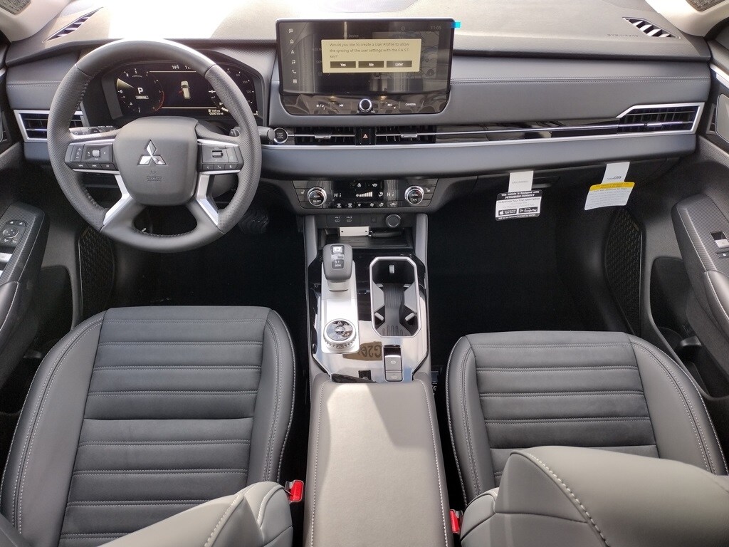 Inside, the Outlander SE offers seven-passenger seating with synthetic leather suede seating surfaces. Comfort features include heated front seats, a heated leather-wrapped steering wheel, and dual-zone automatic climate control. Technology highlights include a 12.3-inch Smartphone-link Display Audio system with navigation, wireless Apple CarPlay, wireless Android Auto, a wireless smartphone charger, a multi-view camera system, and a drive mode selector with multiple terrain settings.